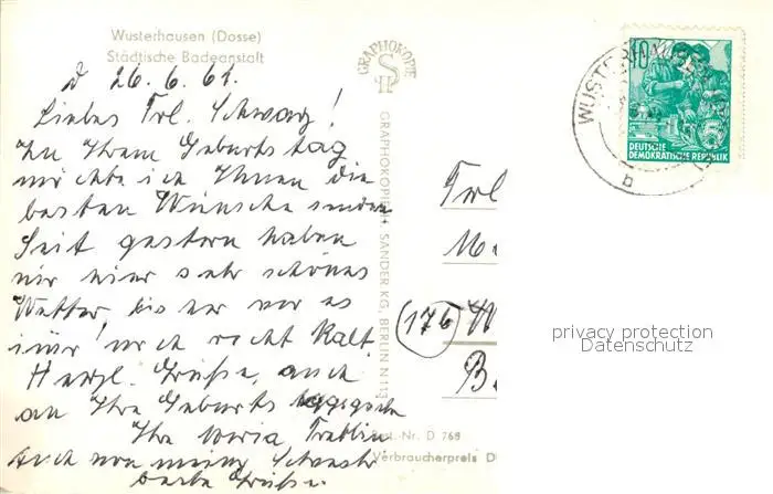 Wusterhausen_Dosse Staedt Badeanstalt Wusterhausen_Dosse postalisch gelaufen 1961 Erhaltung siehe scans [WerneD78] WernPID7