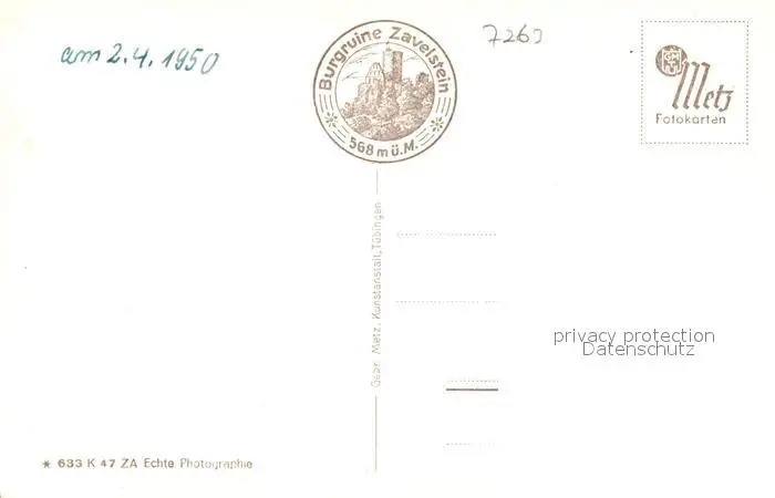 Zavelstein Burgruine Zavelstein postalisch nicht gelaufen 1950 Erhaltung siehe scans [FriedD77] Frierer