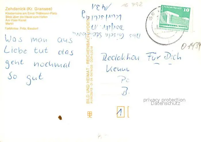 Zehdenick Klosterruine Ernst Thaelmann Platz Havel Hafen Vosskanal Markt Wappen Zehdenick postalisch gelaufen nach 1965 Erhaltung siehe scans [FriedD77] Frierer