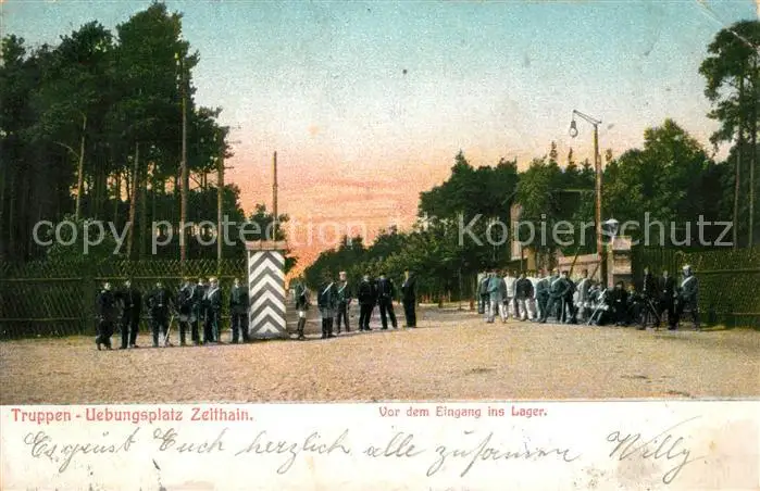 Zeithain Truppenuebungsplatz Eingang ins Lager Zeithain postalisch gelaufen 1910 Erhaltung siehe scans [FriedD77] Frierer