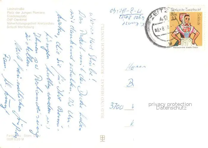 Zeitz Leninstrasse Platz der Jungen Pioniere Friedensplatz OdF Denkmal Naherholungsgebiet Kretzschau Schloss Moritzburg Zeitz postalisch gelaufen 1984 Erhaltung siehe scans [FriedD77] Frierer