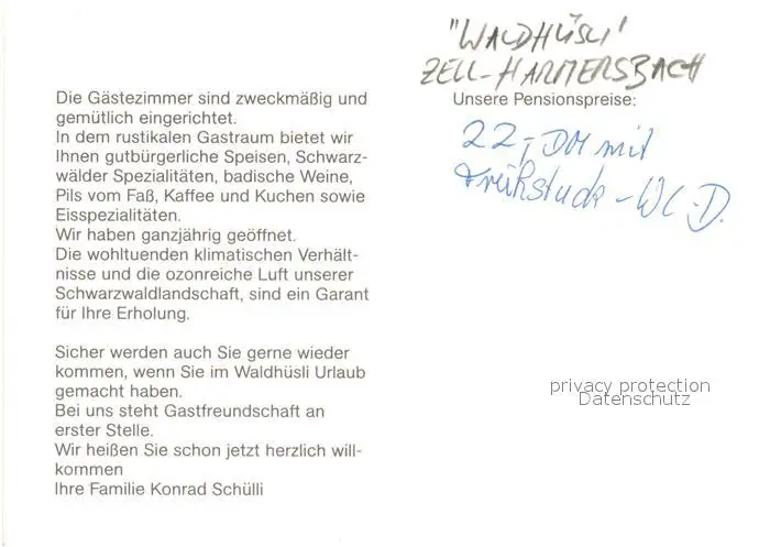 Zell_Harmersbach Gaestehaus Pension Waldhuesli Zell Harmersbach postalisch nicht gelaufen nach 1965 Werbekarte (keine Postkarte) Erhaltung siehe scans [FriedD77] Werbekarte (keine Postkarte) Frierer