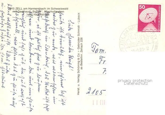 Zell_Harmersbach Panorama Schwarzwald Gasthaus Sonne Pfarrhofgraben Kirche Hauptstrasse Fachwerkhaeuser Zell Harmersbach postalisch gelaufen 1980 Erhaltung siehe scans [FriedD77] Frierer