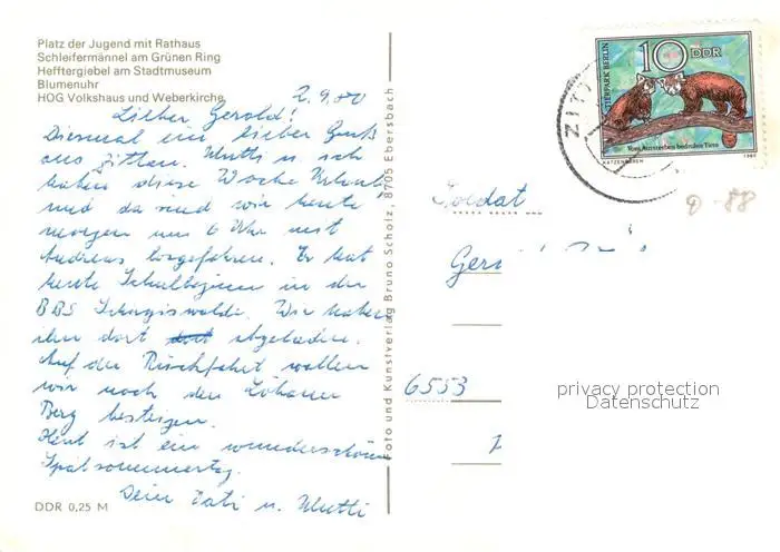 Zittau Platz der Jugend Rathaus Schleifermaennel am Gruenen Ring Hefftergiebl Stadtmuseum Blumenuhr HOG Volkshaus Weberkirche Zittau postalisch gelaufen 1980 Erhaltung siehe scans [FriedD77] Frierer