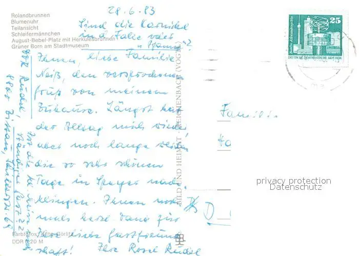 Zittau Rolandbrunnen Blumenuhr Teilansicht Schleifermaennchen August Bebel Platz Herkulesbrunnen Gruener Born Stadtmuseum Wappen Zittau postalisch gelaufen 1983 Erhaltung siehe scans [FriedD77] Frierer