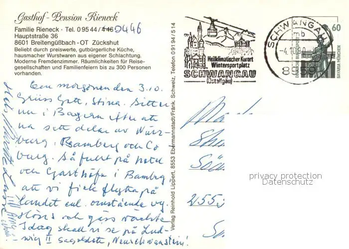 Zueckshut Gasthof Pension Rieneck Zueckshut postalisch gelaufen 1990 Erhaltung siehe scans [FriedD77] Frierer