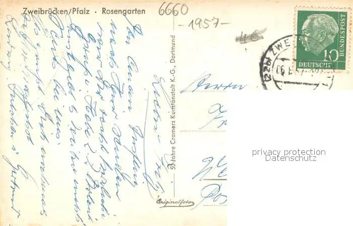 Zweibruecken_Pfalz Rosengarten Zweibruecken Pfalz postalisch gelaufen 1957 Erhaltung siehe scans [FriedD77] Frierer