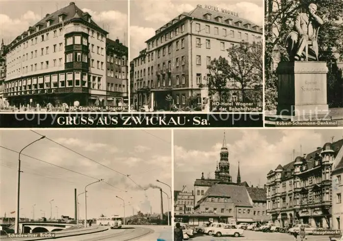 AK / Ansichtskarte Zwickau_Sachsen HOG Ringcafe HO Hotel Wagner Robert Schumann Denkmal Schedewitzer Bruecke Hauptmarkt Zwickau Sachsen