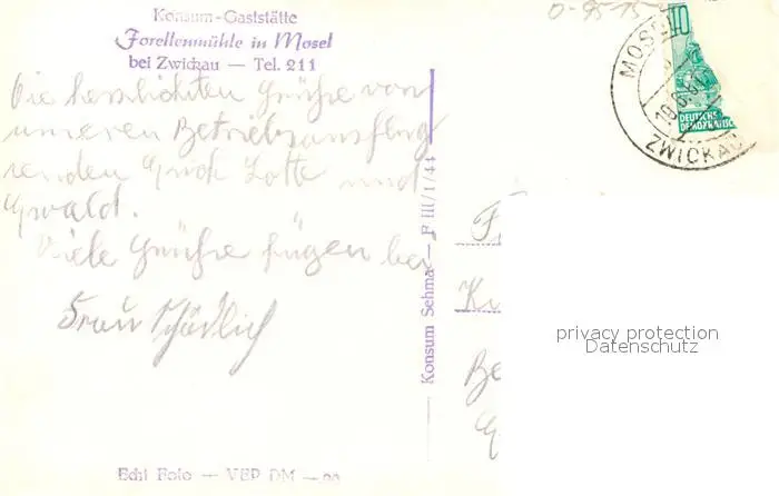 Zwickau_Sachsen Konsum Gaststaette Forellenmuehle Details Zwickau Sachsen postalisch gelaufen 1961 Erhaltung siehe scans [WerneD78] WernPID7