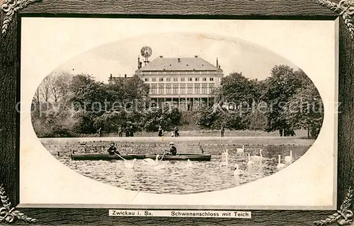 AK / Ansichtskarte Zwickau_Sachsen Schwanenschloss mit Teich Ruderboot Schwaene Zwickau Sachsen