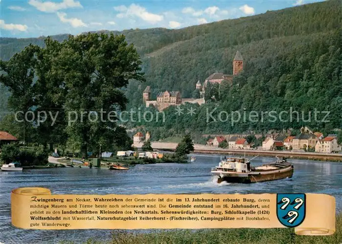 AK / Ansichtskarte Zwingenberg_Neckar Frachtkahn Binnenschifffahrt Blick zur Burg Campingplatz am Fluss Zwingenberg Neckar
