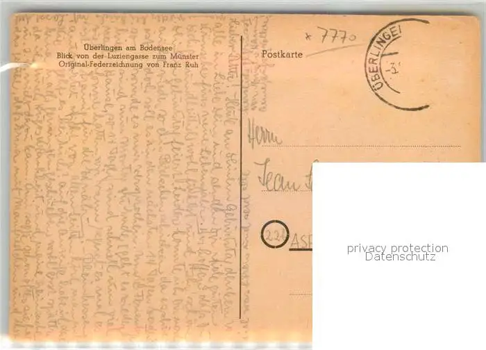 ueberlingen_Bodensee Blick von Luziengasse zum Muenster Federzeichnung Franz Ruh ueberlingen Bodensee postalisch gelaufen 1921-1965 Erhaltung siehe scans [KathaD81] Kathoren