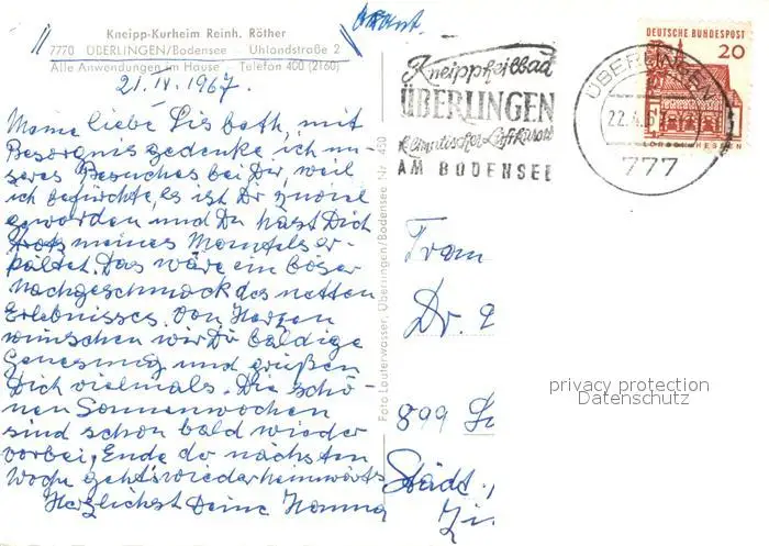 ueberlingen Bodensee Kategorie Alte Ansichtskarten Postkarten bx56927 ueberlingen_Bodensee Kneipp Kurheim Roether ueberlingen Bodensee postalisch gelaufen 1967 Erhaltung siehe scans [WerneD78]