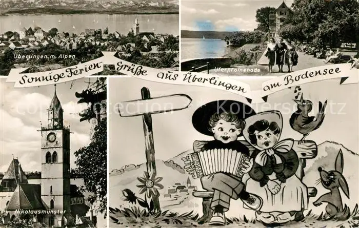 AK / Ansichtskarte ueberlingen_Bodensee Panorama mit Alpen Uferpromenade Nikolausmuenster Karikaturen ueberlingen Bodensee