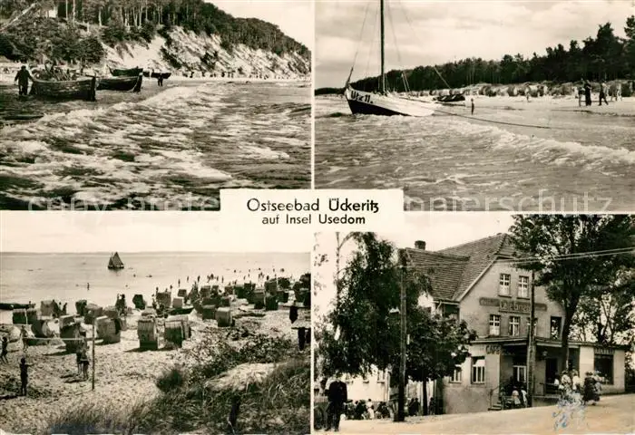 AK / Ansichtskarte ueckeritz_Usedom Strand Fischerboote Cafe Baeckerei ueckeritz Usedom