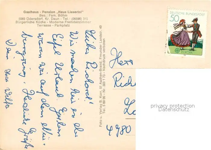 uedersdorf Gasthaus Pension Haus Liesertal uedersdorf postalisch nicht gelaufen 1981 Erhaltung siehe scans [FriedD77] Frierer