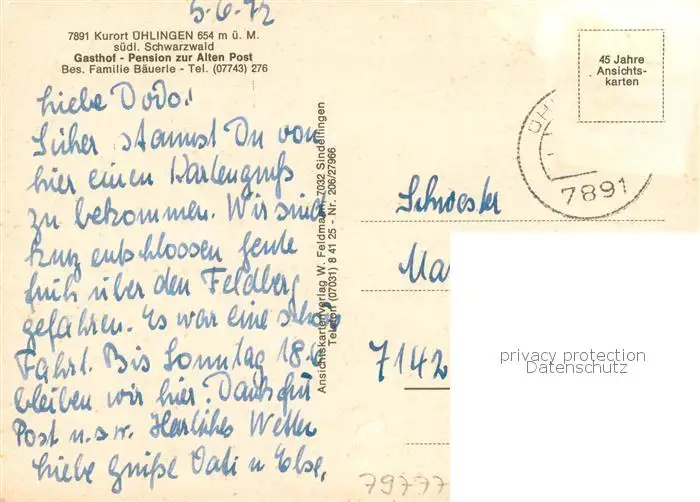uehlingen-Birkendorf Gasthof Pension zur alten Post Kurort im Schwarzwald uehlingen-Birkendorf postalisch gelaufen 1972 Erhaltung siehe scans [FriedD77] Frierer