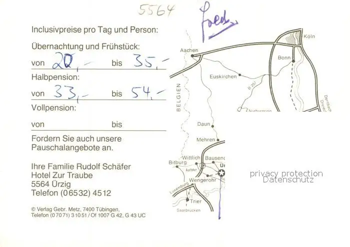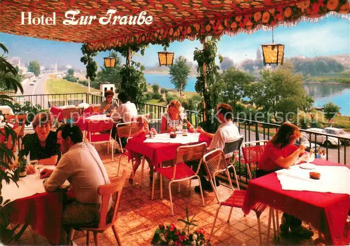 uerzig Hotel Zur Traube Restaurant Terrasse Mosel uerzig postalisch nicht gelaufen nach 1965 Werbekarte (keine Postkarte) Erhaltung siehe scans [FriedD77] Werbekarte (keine Postkarte) Frierer
