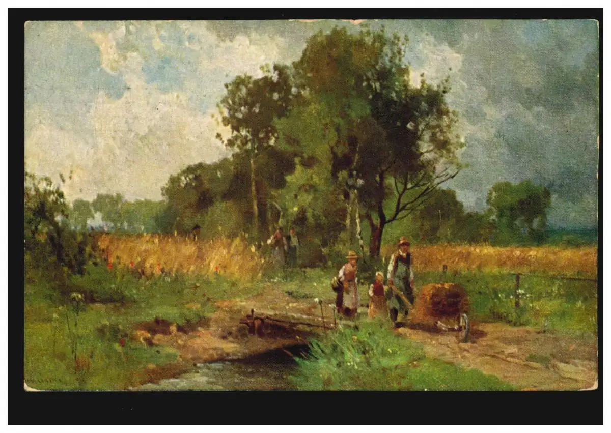 AK Artiste Après le travail sur le terrain - Les paysans en chemin de retour, MUNICH 28.7.1910