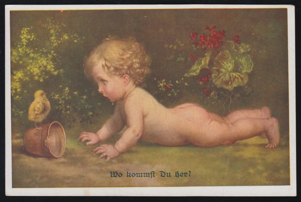 AK Artiste D'où viens-tu ? - Poussins avec enfant, maison d'édition Munk, inutile
