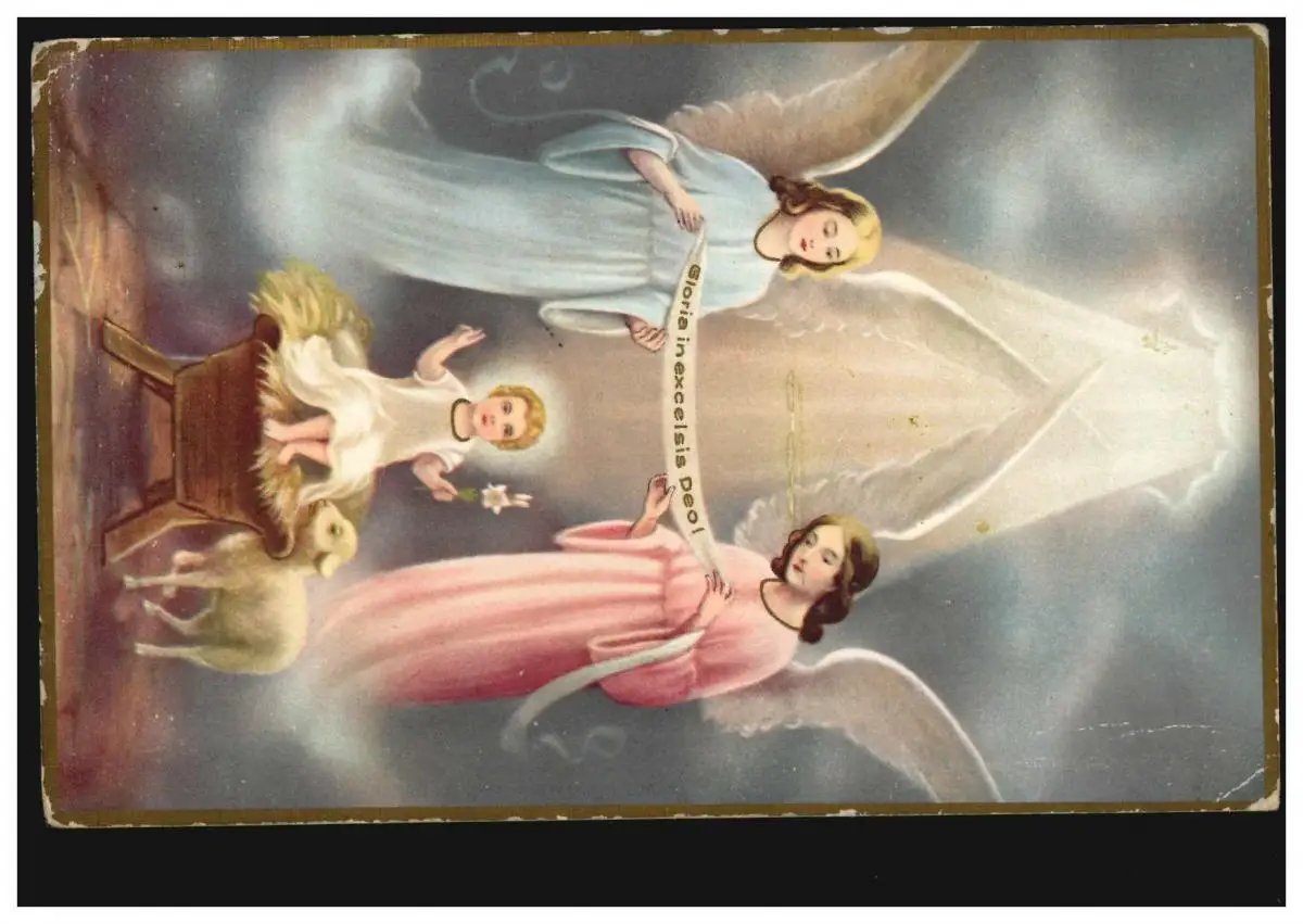 AK Artiste Noël Gloria in excelsis Deo! Ange et l'Enfant-Jésus dans la crèche