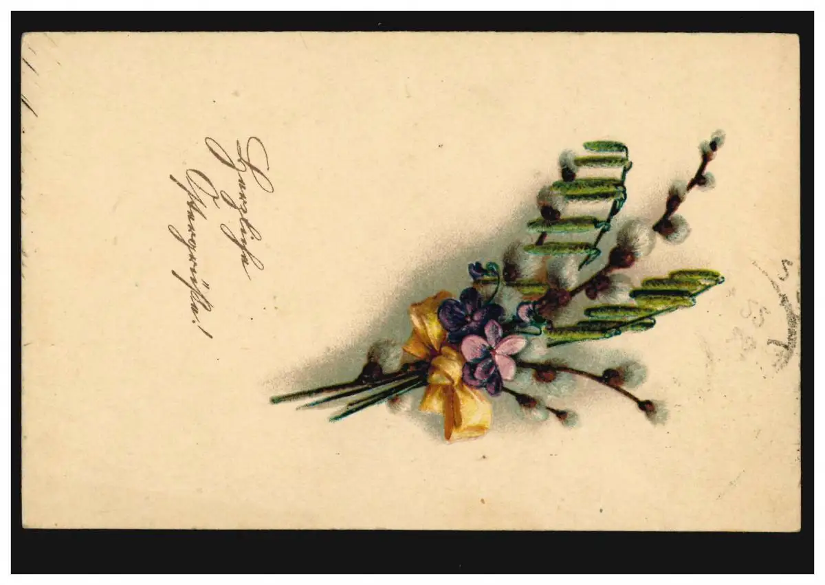 AK Artiste Pâques - Chaton de pâture aux fleurs, poste de train 16.4.22 vers Hildesheim