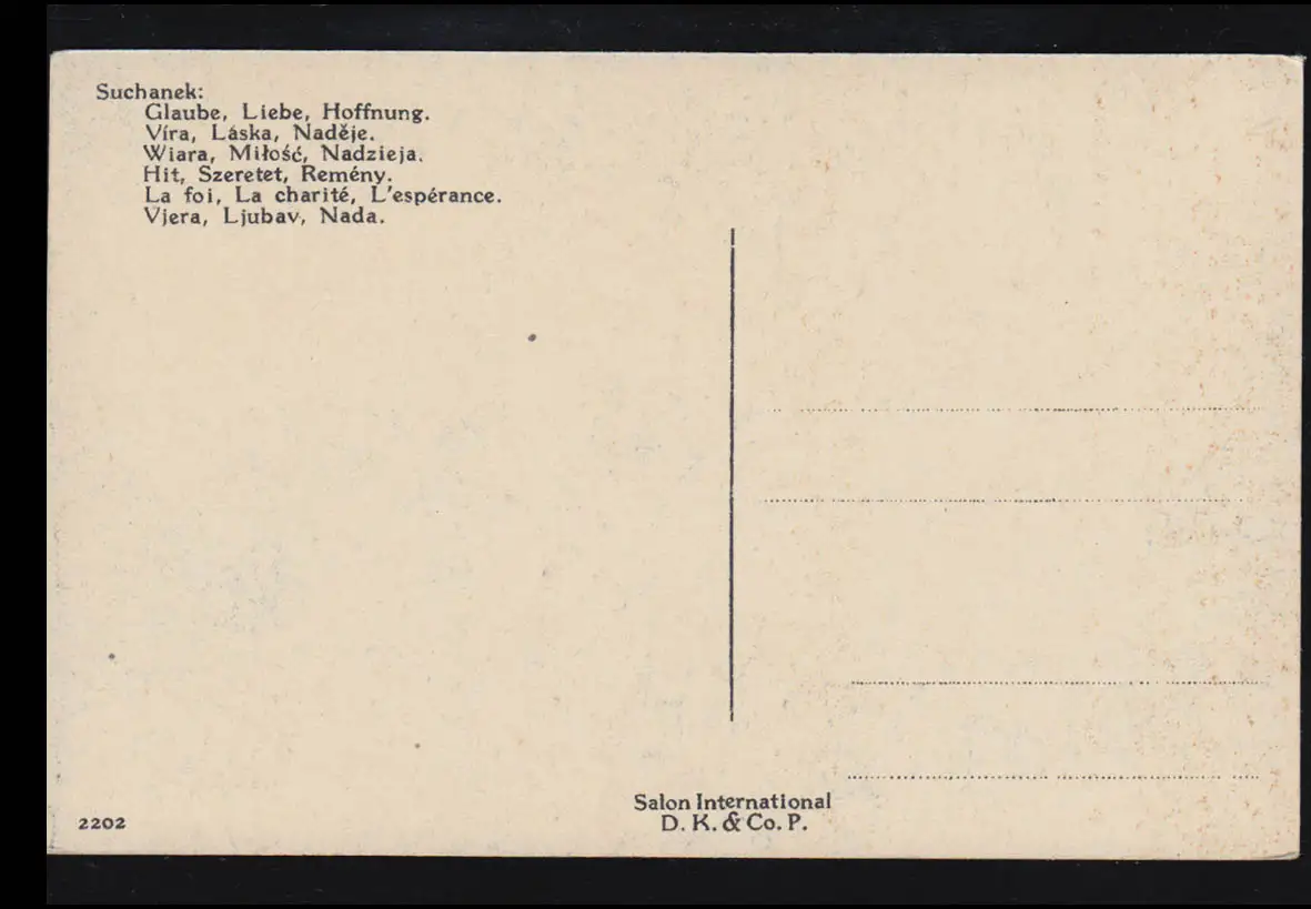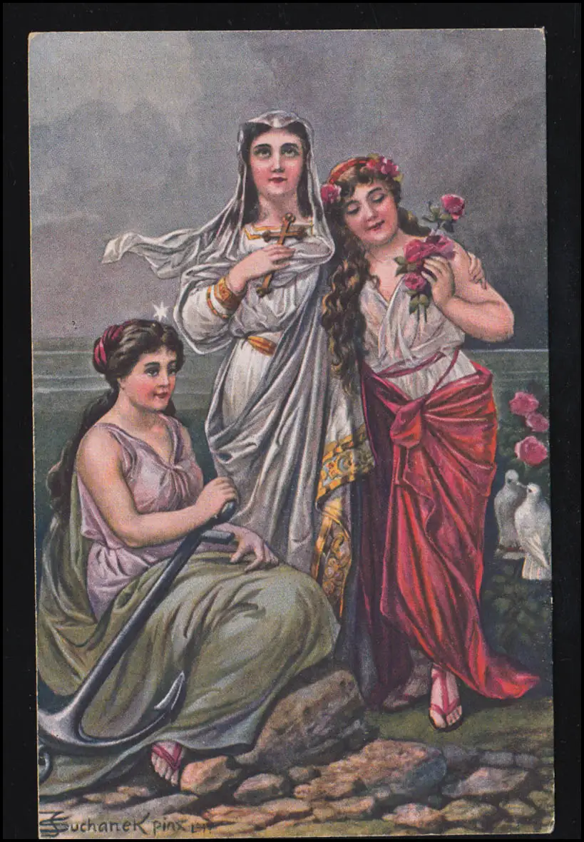 AK Artiste Suchanek: Foi, Amour, Espoir - Croix, Roses, Ancre, Imbr.