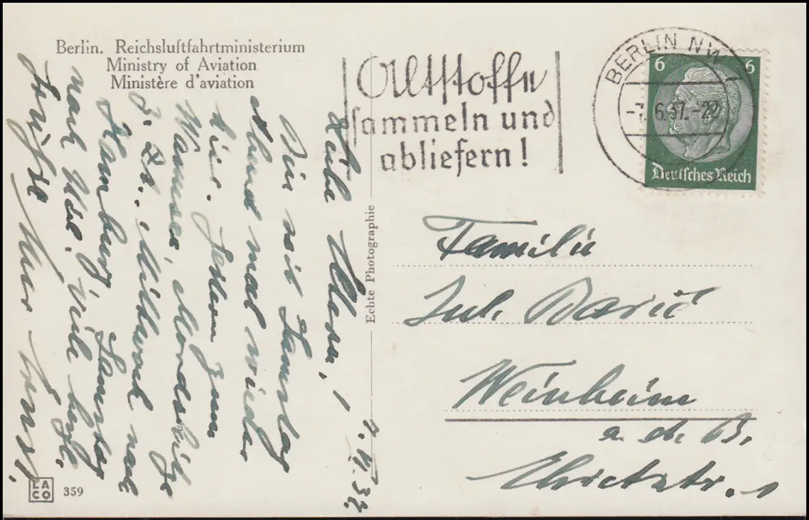 AK Berlin Reichsahrungsministerium trilingue, BERLIN 7.6.1937 vers Weinheim