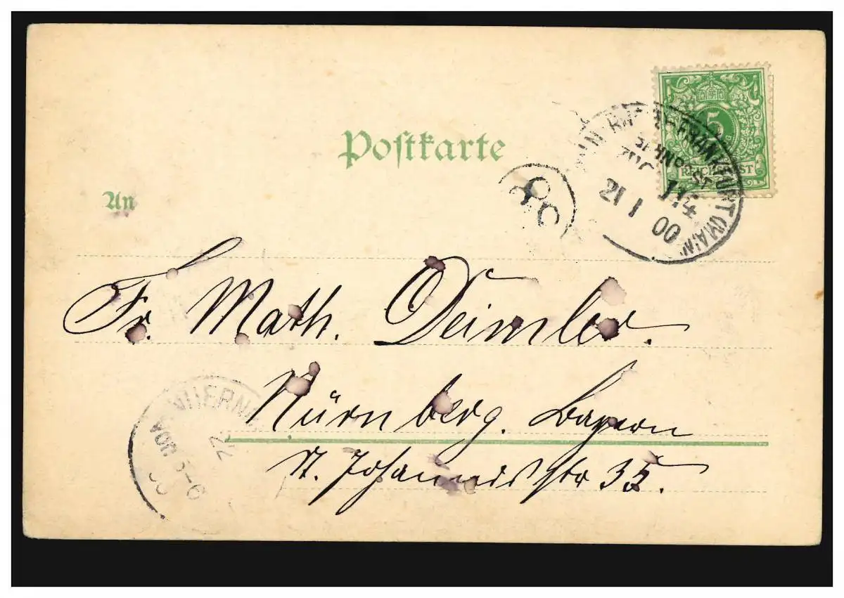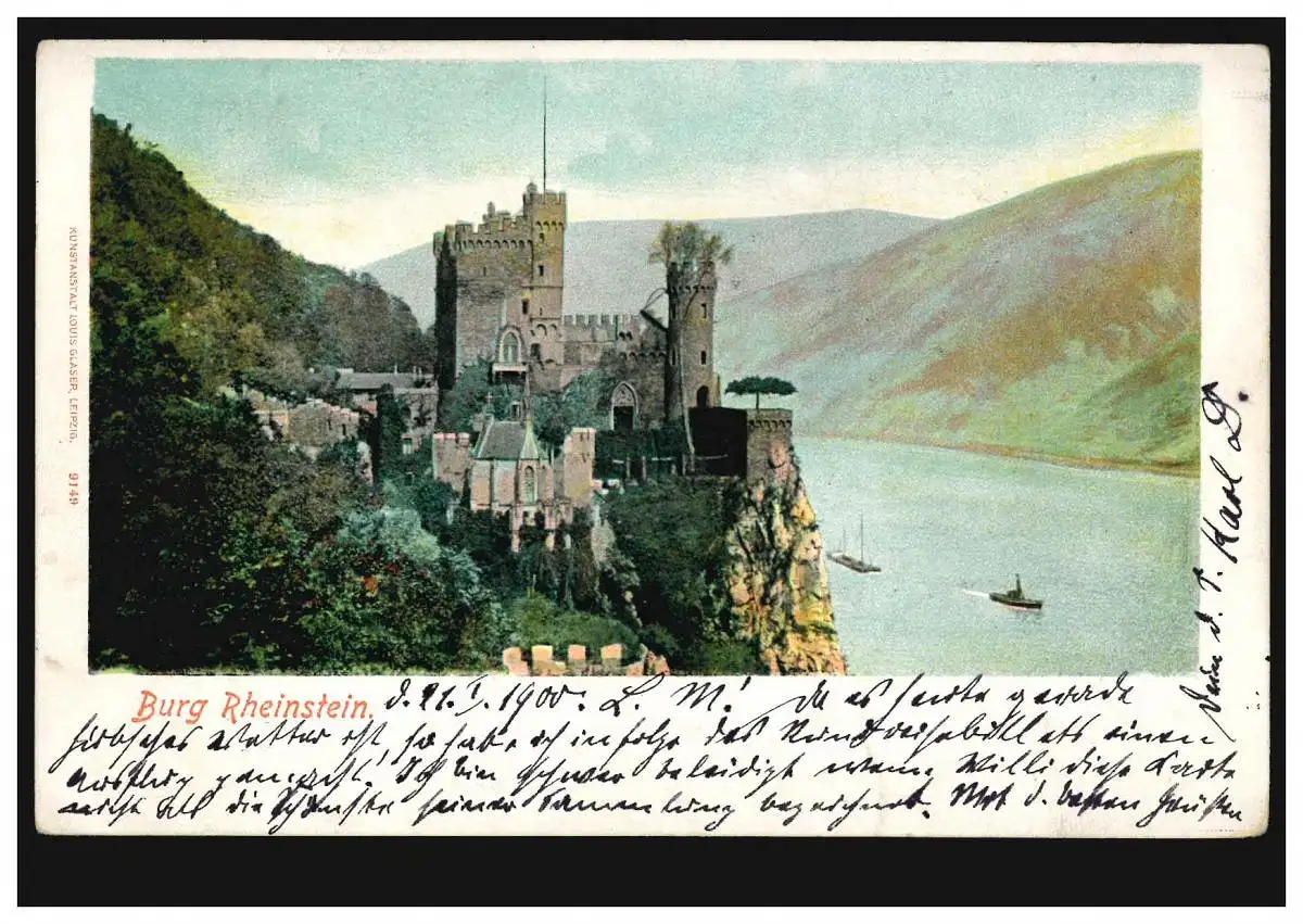 AK Burg Rheinstein, Bahnpost CÖLN (RHEIN) - FRANKFURT (MAIN), ZUG 114 - 21.1.1900