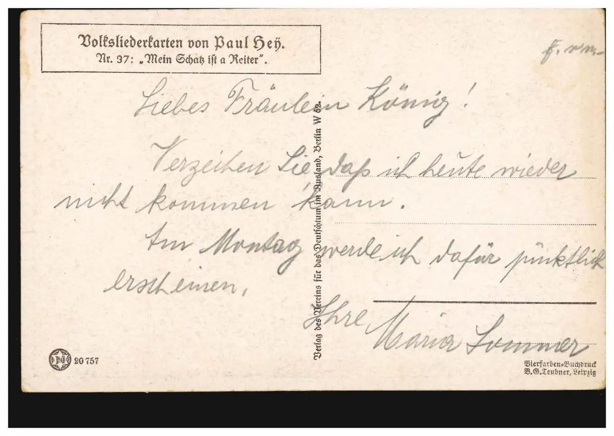 AK Carte de chants populaires Paul Hey: Mon trésor est un cavalier, marqué