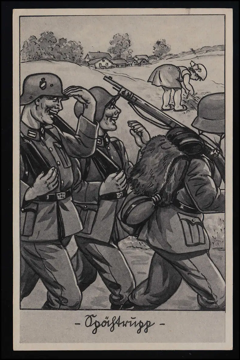 AK Cekade 42/ 3 "équipe de suivi" soldats se faufilent sur une femme courbé, poste de terrain 29.4.43