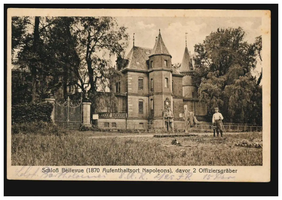 AK Château de Bellevue (1870 séjours de Napoléon) avant 2 tombeaux d'officiers, 23.5.16