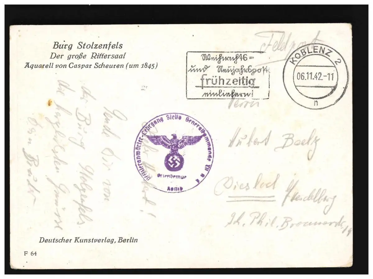 AK Château de Stolzenfels Grand Salle de Chevaliers Scheuren, Poste de Champ, Coblence 6.11.1942