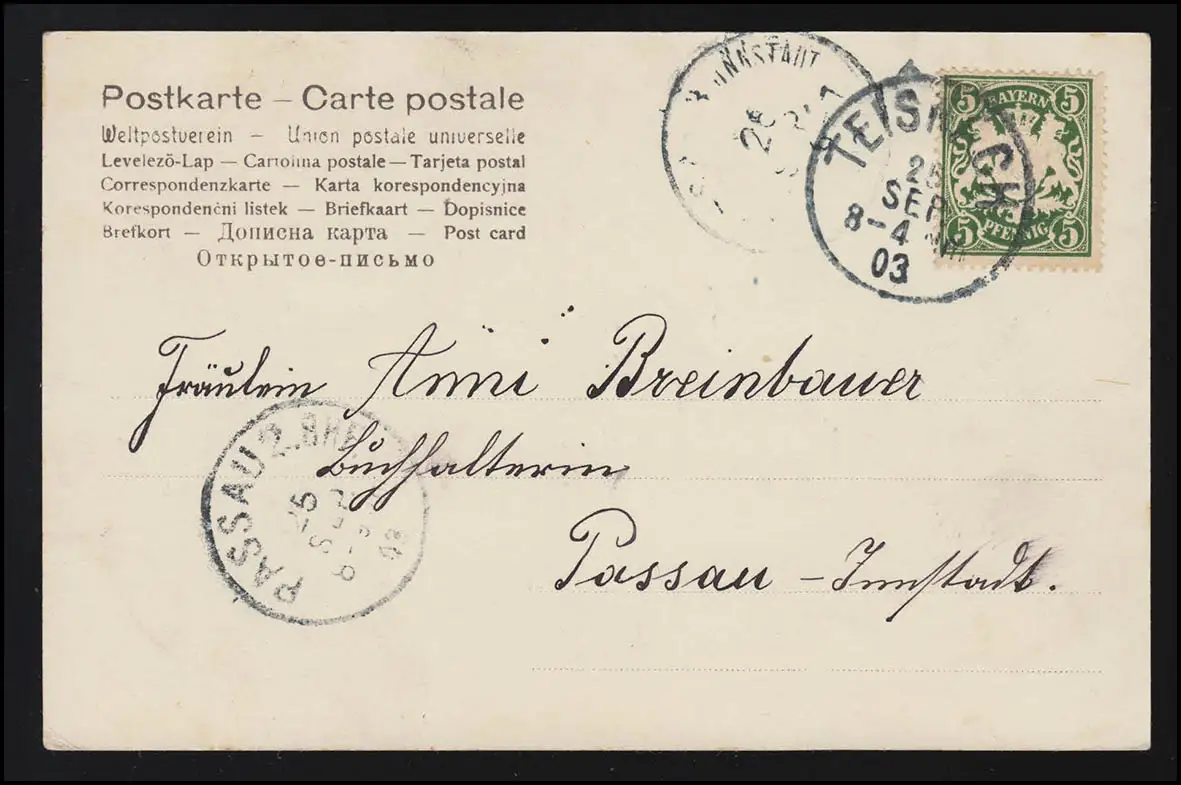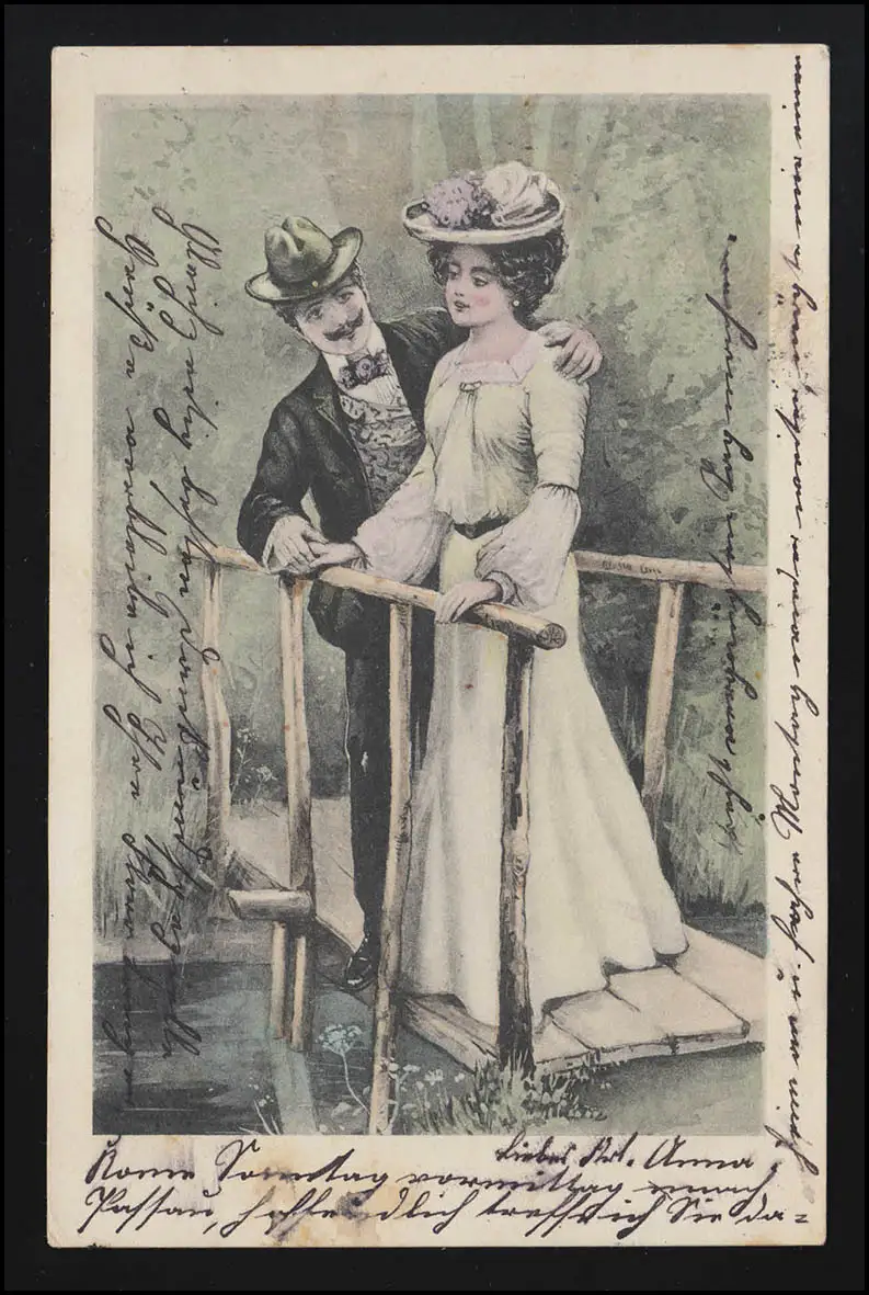 AK Cher artiste couple d'amour est embrassé sur le pont, TÉISNACH/ PASSAU 25.9.1903