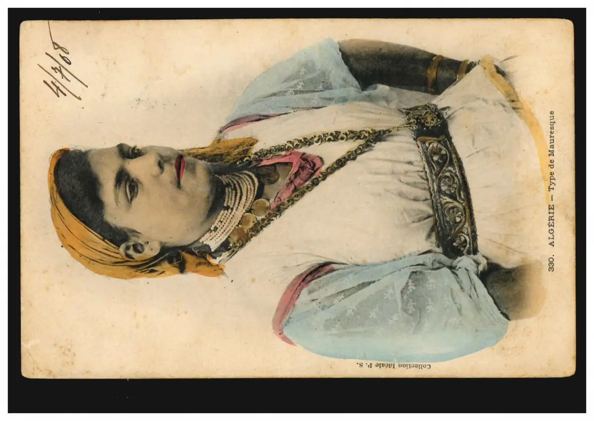 AK Costumes: Algérie - Trait des Mauresque / Type de Maturesque, 1908