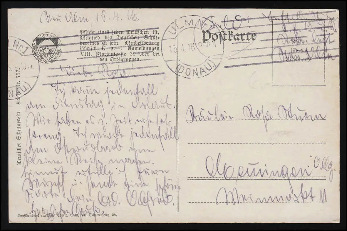 AK Deutscher Schulverein No. 777 Dernier sign. E.B. Feldpost ULM 15.4.16