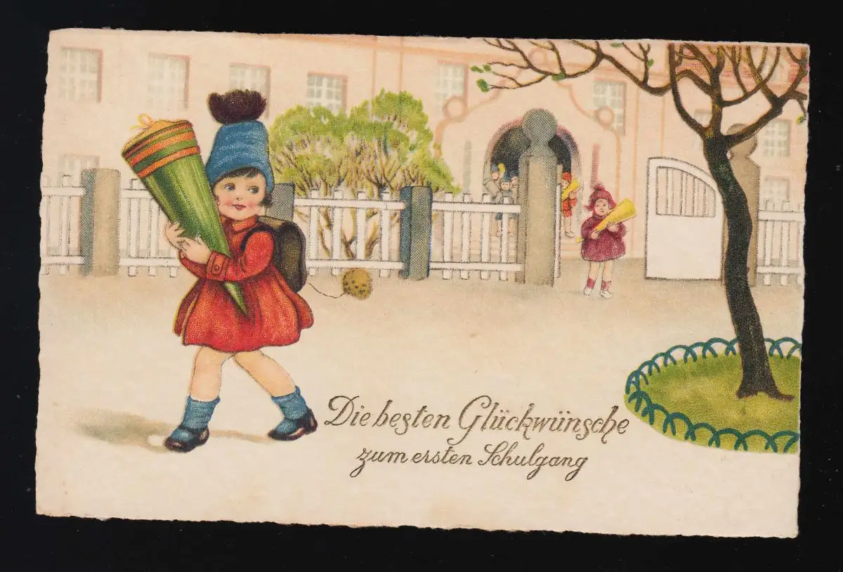 Les meilleures félicitations pour le premier cours. Fille en robe rouge et bonnet bleu devant l'école, sac d'éducation décoré, les autres filles attendent à l 'entrée. Variante miroir de la carte visuelle: Fille tourne à gauche. Examen: original Référence produit: 00000000045858>Remarque: Cet article n'est disponible qu'une fois. Vous recevrez exactement l\'article illustré.