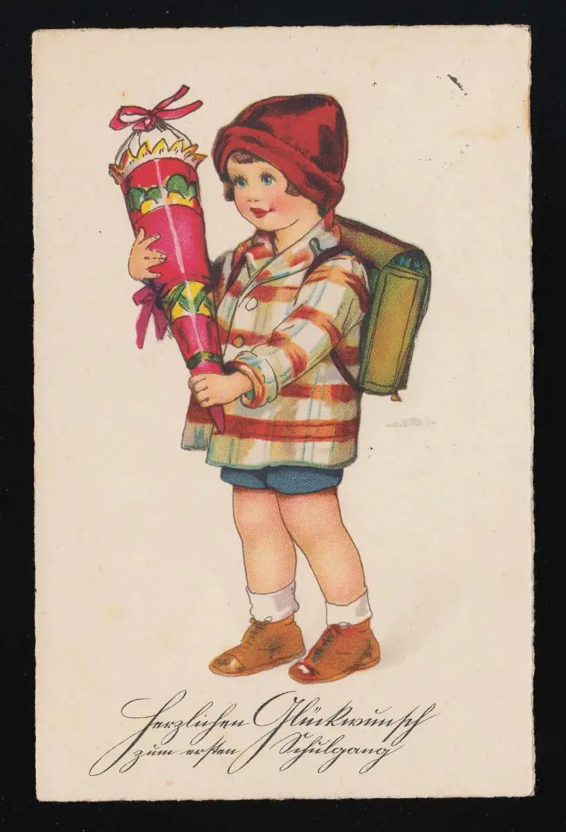 AK Enfants Fille tient sac d'école rose coloré devant lui-même le cours Magdeburg 11.4.34