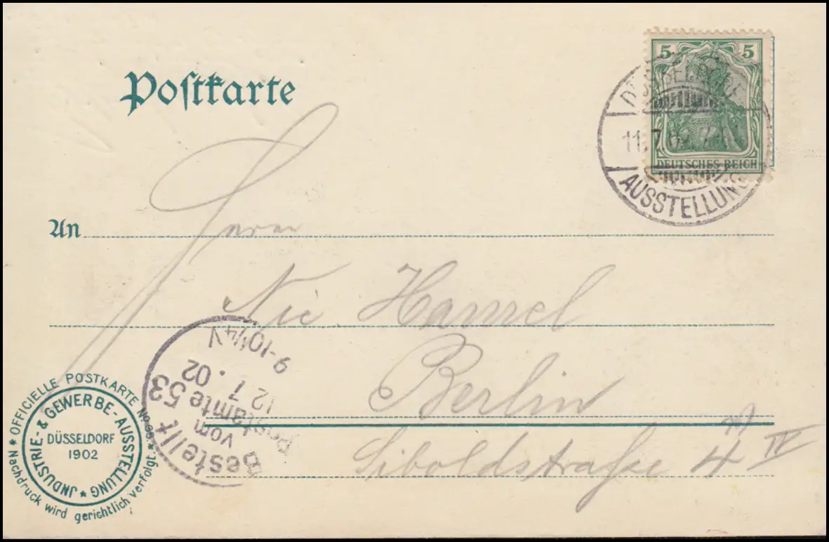 Carte postale DÜSSELDORF-EXposition 11.7.1902 après Berlin Commande du bureau de poste 53 - 12.7.2. Vérification: original Référence produit: 00000000032143>p>Remarque: Cet article n'est disponible qu'une seule fois. Vous recevrez exactement l'article représenté.