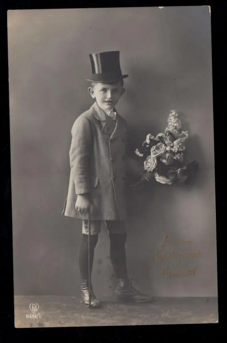 AK Félicitations Nom: Garçon avec cylindre et canne à marcher, Maison-Bourse 24.7.1916