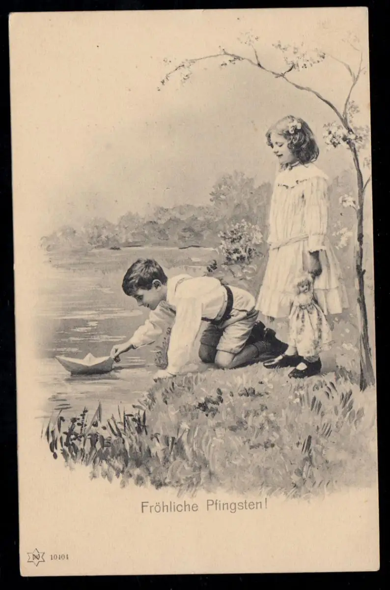 AK Félicitations Pentecôte: les enfants jouent avec bateau en papier et poupée, non utilisé