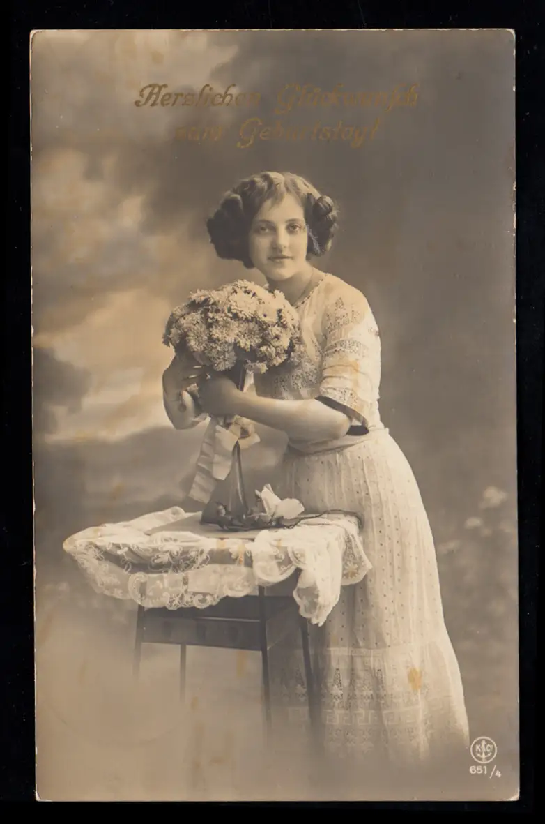 AK Félicitations anniversaire: Femme avec vase de fleurs, table, NIEDERODERWIT 1912