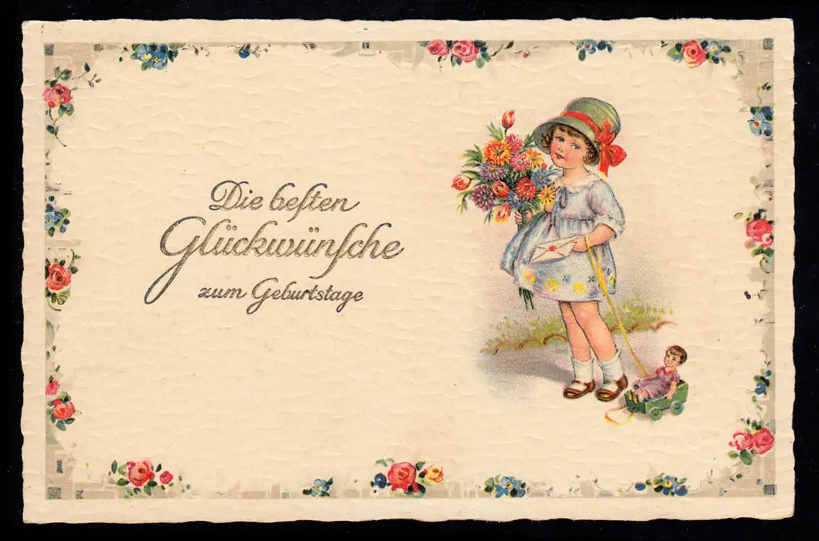 AK Félicitations anniversaire: Fille avec des fleurs et poupée, MAISON 4.1.1932