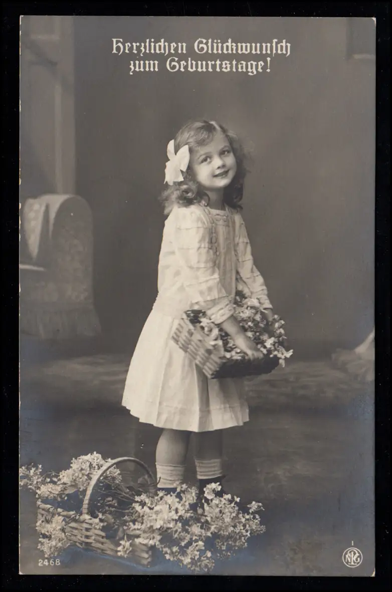 AK Félicitations anniversaire: Fille souriante avec paniers de fleurs MAISSINE 2.10.12