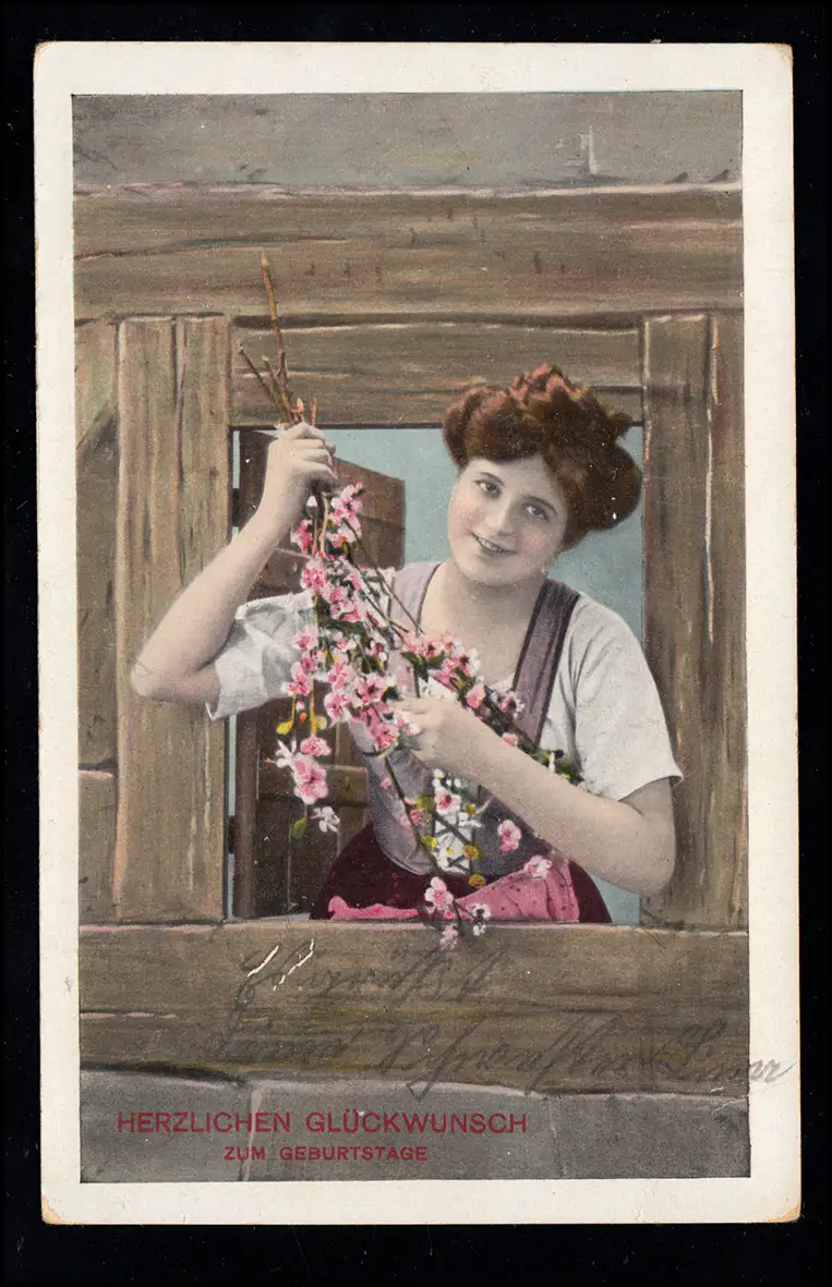 AK Félicitations anniversaire: femme avec des fleurs dans la fenêtre, STEYERBERG 20.5.1913
