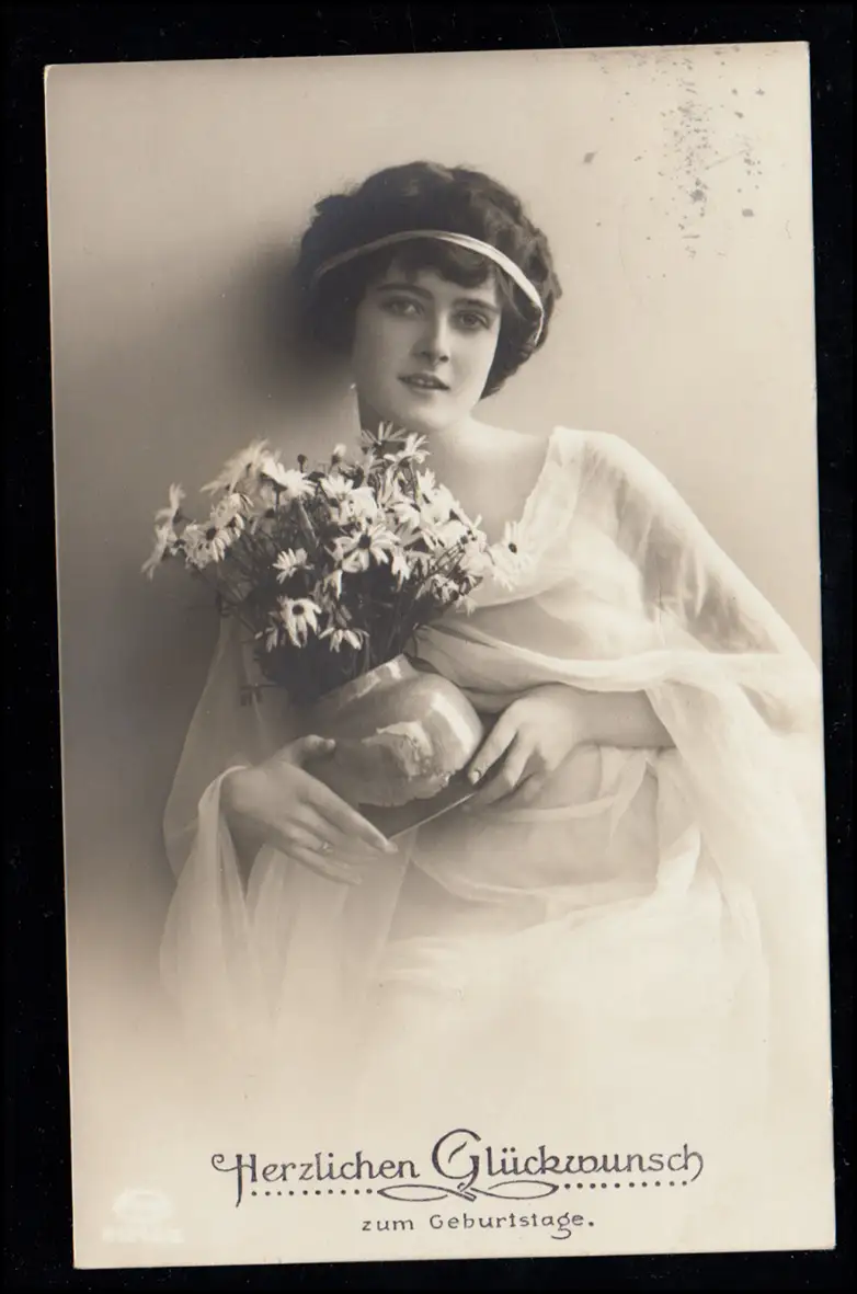 AK Félicitations pour l'anniversaire: Femme souriante avec vase de fleurs GERA (REUSS) 5.12.1915