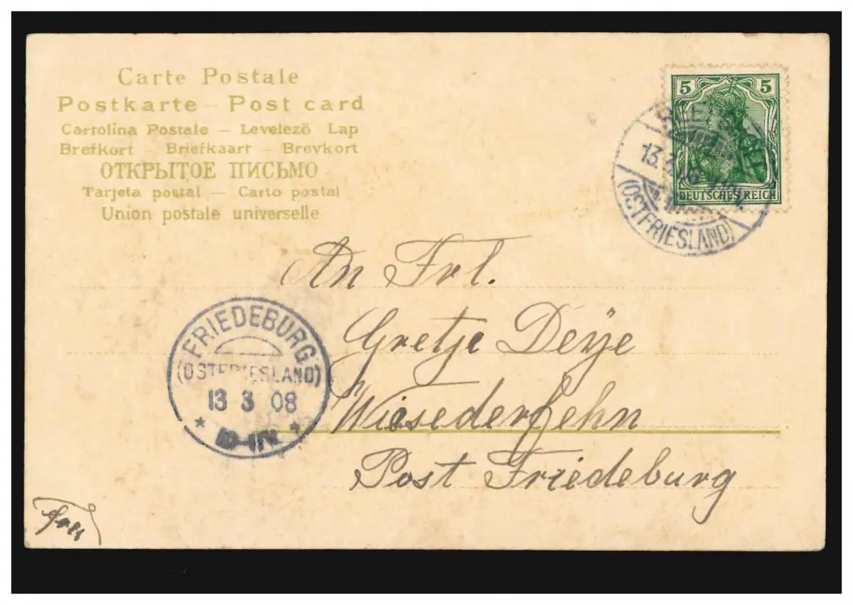 de REEPSHOLT (FRAISIE-EST) 13.3.1908 vers FRIEDEBURG (ESPACE-Est) 13.3.08 Vérification: original Référence produit: 00000000019949>Note: Cet article n'est disponible qu'une seule fois. Vous recevrez exactement l'article représenté.