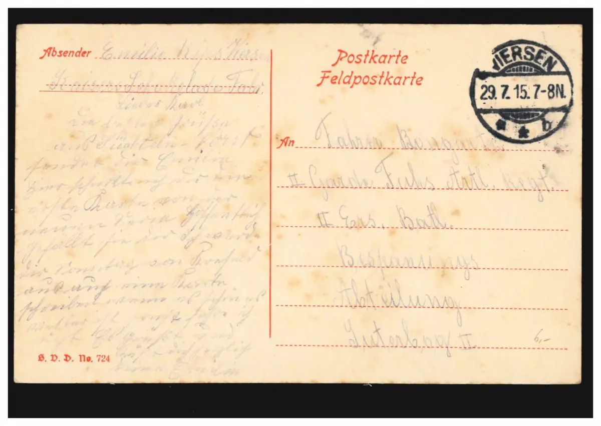 Carte postale de champ QUATRIÈME 29.7.1915 au 2ème Garde Réserve Fussartillerie Régiment 17, Editeur S.D. D. No. 724 Vérification: original Référence produit: 00000000038681>Note: Cet article n'est disponible qu'une seule fois. Vous recevrez exactement l'article représenté.