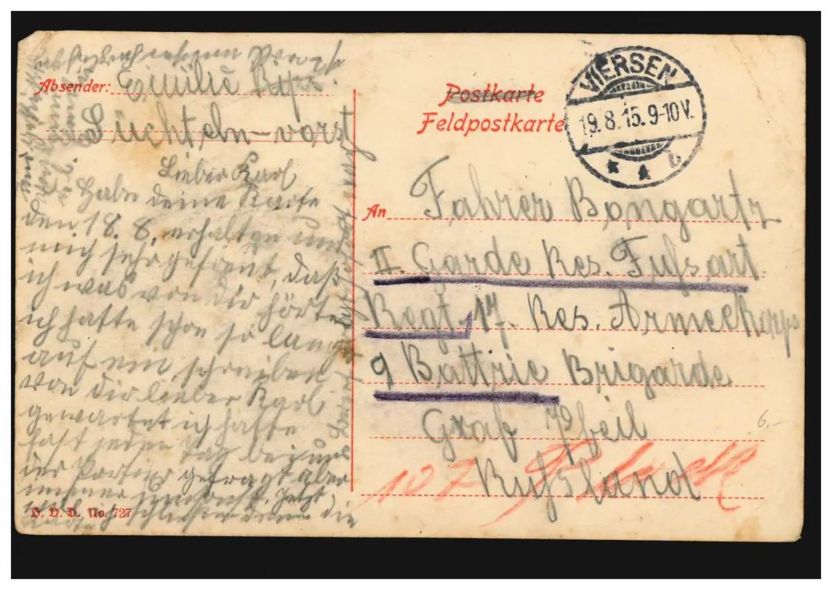 Carte postale de champ au 2ème Garde Reserve Fussartillerie Régiment 17, Editeur S.D. D. No. 727 Examen: original Référence produit: 00000000038683