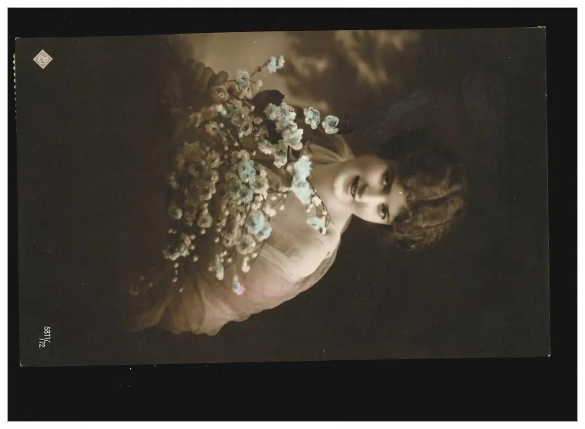 AK Femmes: Femme souriant avec des fleurs bleues, Asch